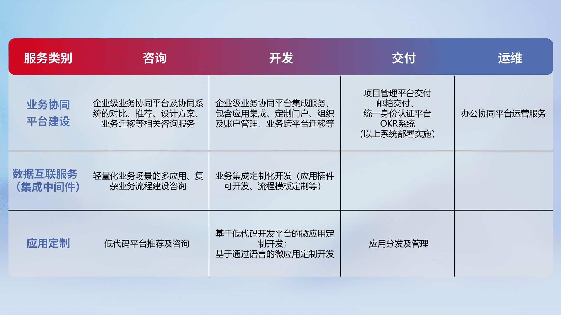 针对钉钉、、企微、、、IDaas等平台级产品提供产品的规划、、方案、、、、交付、、、、定制化开发等服务,,实现如统一协同办公、、、智能客户服务、、、、混合会议管理、、智能数据查询、、等业务场景,,,实现数字化转型。。。。